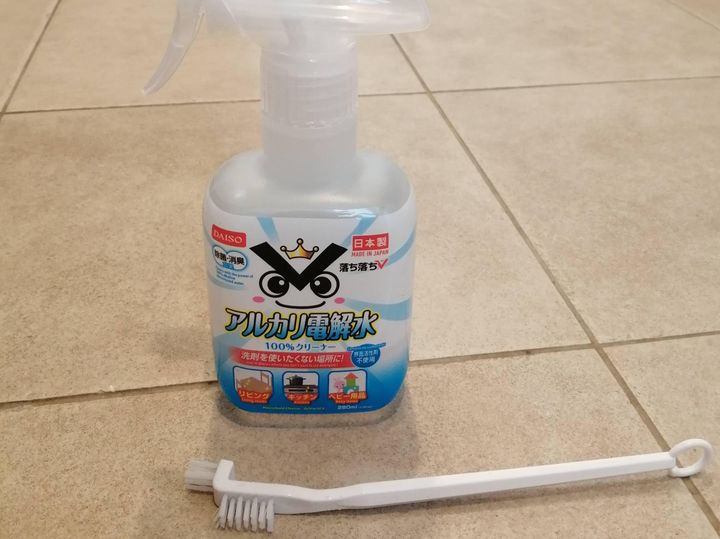 特に期待もせず、アルカリ電解水を吹きかけてブラシでこすってみました。みるみる汚れが掻き出され、衝撃しかありませんでした。気が付けばキッチン床のタイルを夢中で掃除しており、購入したてのアルカリ電解水のボトルが、空になっていることに気が付きました。
