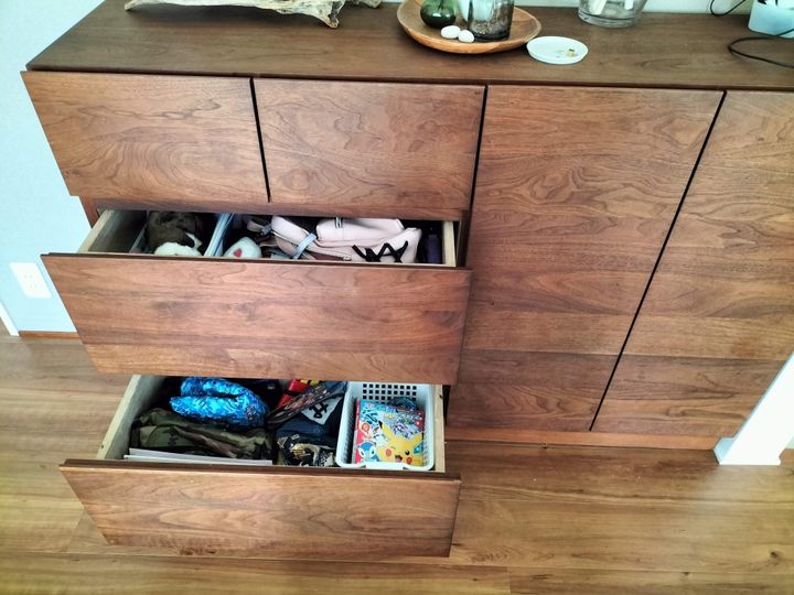 このように一人一カ所は、物の駆け込み場を用意しています。こうすることで、リビングに不意に出てきた物を、人別に振り分けて放り込むだけで済むのです。