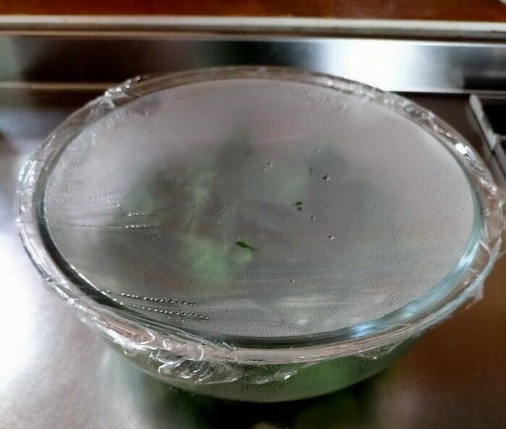 ということで、ラップは余裕を持ってゆったりですが、周囲は空気が逃げないように容器にぴったり貼り付けます。これとっても重要。(写真は周囲もゆるく見えるかもしれませんが、熱が逃げないように気を付けてます)。