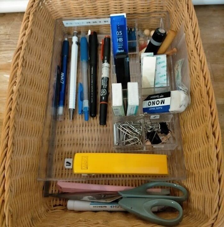 ここに入れるのは、家族がよく使う「1軍の文房具」を必要量のみ。間違っても同じペンを何本も入れたり、数カ月に一回しか使わないモノはいれません。