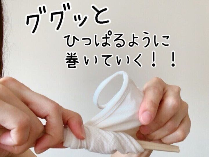 割りばしにひっかけたヒモがずれないように割りばしを持っている手で押さえます。ずれないように抑えながら、反対の手を使って布マスクを割りばしにくるくると巻き付けていきます。
