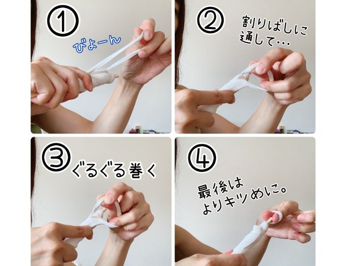 巻き付けていくときのポイントはググッと引っ張るように力を入れます。緩く巻いていくと布マスクがすぐにたるんでしまうので、うまく固定できなくなります。