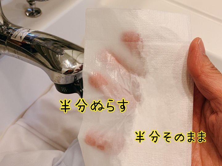 まずは紙ナプキンを1枚準備します。その半分部分を濡らし、半分はできるだけ乾いた状態でキープします。ビシャッと濡れてしまった場合は、1枚濡らす用で1枚は乾いた用で2枚準備してもらえたら大丈夫です!!