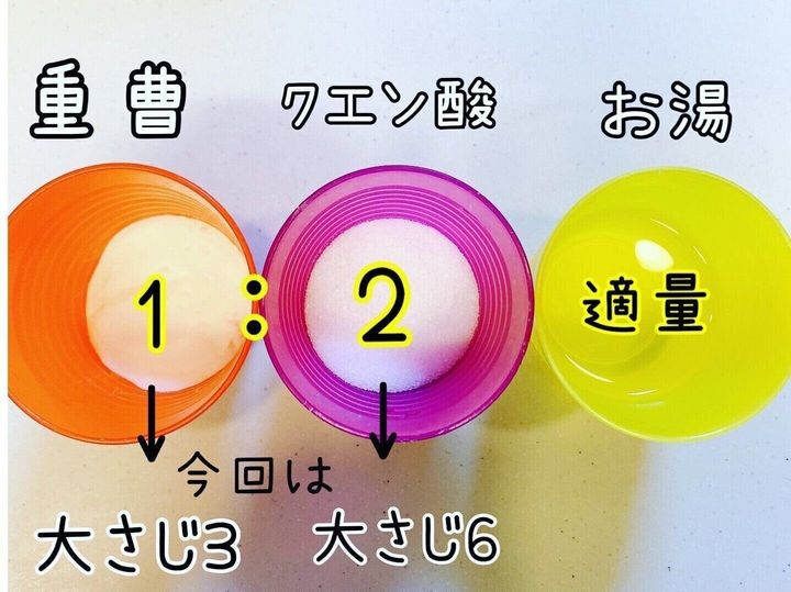 重曹:クエン酸=1:2の割合で準備してみて下さい。例えば、重曹を大さじ3ならクエン酸は大さじ6を準備します。お湯は適量です。