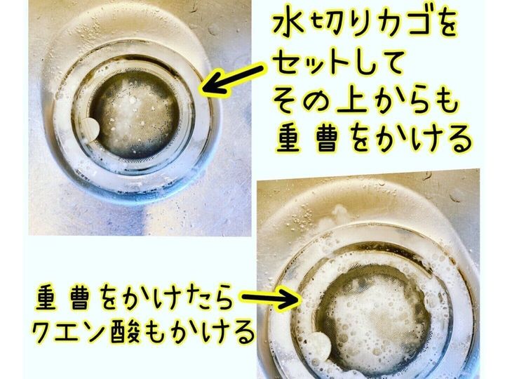 外していた水切りカゴを元に戻します。この時も事前に水切りカゴのゴミは除去しておいてください。三分の一ずつ残していた重曹とクエン酸を同じ要領で振りかけていきます。