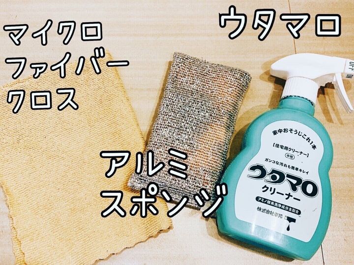 物干し竿掃除をする際に、準備するものは、「ウタマロ」「アルミスポンジ」「マイクロファイバークロス」の3点です。マイクロファイバークロスは、水拭き用と乾拭き用に2枚準備してください。