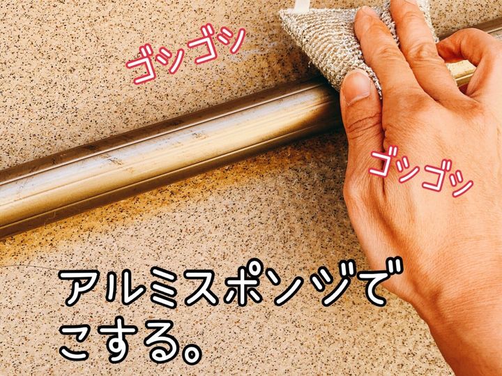 ウタマロをかけた箇所はアルミスポンジで擦り、汚れを取りましょう。物干し竿の素材によっては、サビがつきやすいこともあります。アルミスポンジではサビが取れにくいかもしれませんので、その場合はコゲ取りスポンジを使ってみて下さい。その時は、物干し竿を傷つけないか目立たない所で試してからご使用ください。(コゲ取りスポンジを使用する際は、サビの部分にだけお使いください。傷つけやすいので、全体を擦るのはお控えください)
