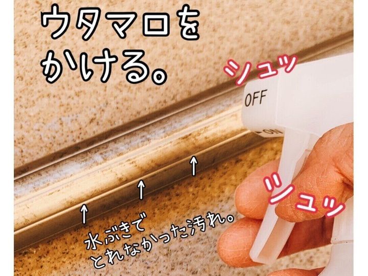 水拭きで汚れが取れない箇所はウタマロの力を借りましょう。汚れに向かってウタマロをシュシュッとかけます。
