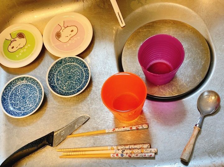 シンクに置くときに、箸は箸でかためておく、お皿ゾーン、コップゾーンと種類別に仕分けしながら置きます。これは我が家では家族みんなで共有しているルールです。こうすることで箸をまとめて洗え、効率もよくなります。洗い物が多く、シンク内がパンパンになりそうなときは無理にシンクに置かずに調理台も活用して、重ねずに種類ごとに置くという習慣をつけていきます。