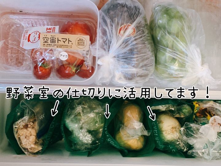 冷蔵庫の野菜室でこの水切りゴミ袋を活用しています。いろいろな種類の野菜をポンポンと野菜室に入れると在庫管理がしにくく、腐らせてしまったり、何度も同じ野菜を買ってきてしまったりというミスが起こります。この水切りゴミ袋を仕切り代わりにして仕分けると一目でどんな野菜が在庫としてあるのかが一目で把握できます。