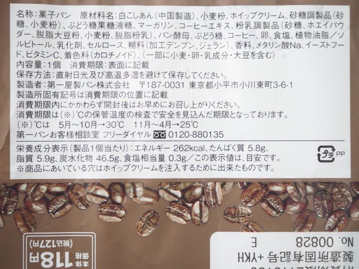 パッケージもダイドーブレンドコーヒー仕様になっている菓子パンです。価格は127円(税込)で、消費期限は購入日を含む3日程度のようです。