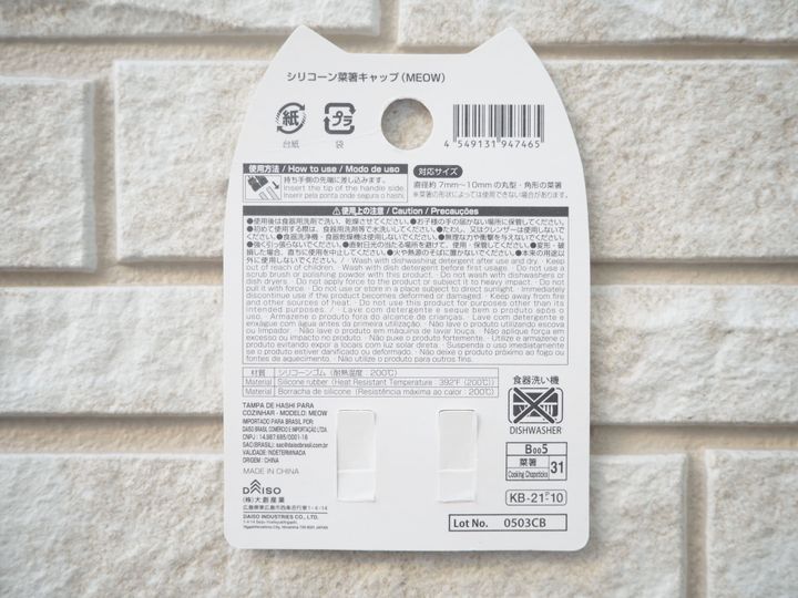 こちらが「シリコーン菜箸キャップ(MEOW)」で、価格は110円(税込)です。調理器具コーナーの「MEOW」シリーズを扱う棚で発見!