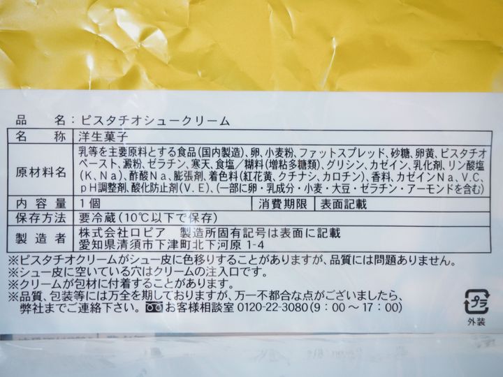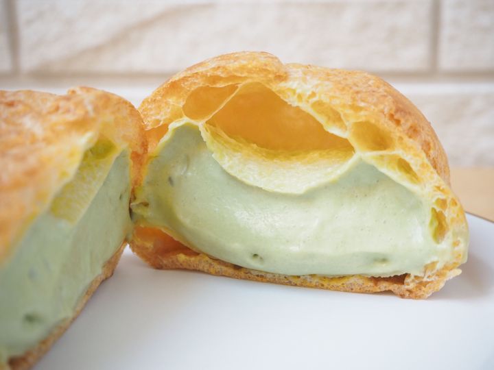 ピスタチオの風味を楽しめるシュークリームで、こちらの商品にはピスタチオペーストが使用されています。