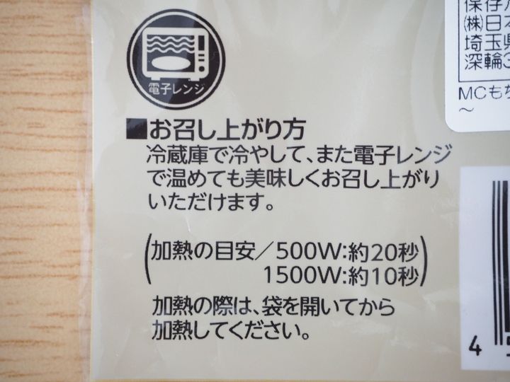 電子レンジでの加熱の目安は500Wで約20秒です。
