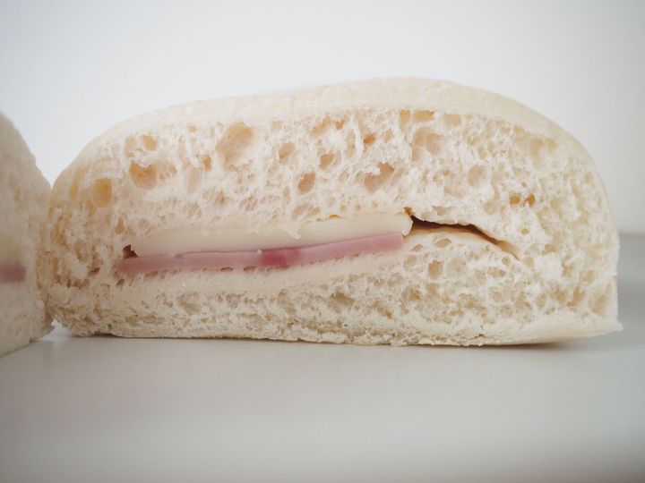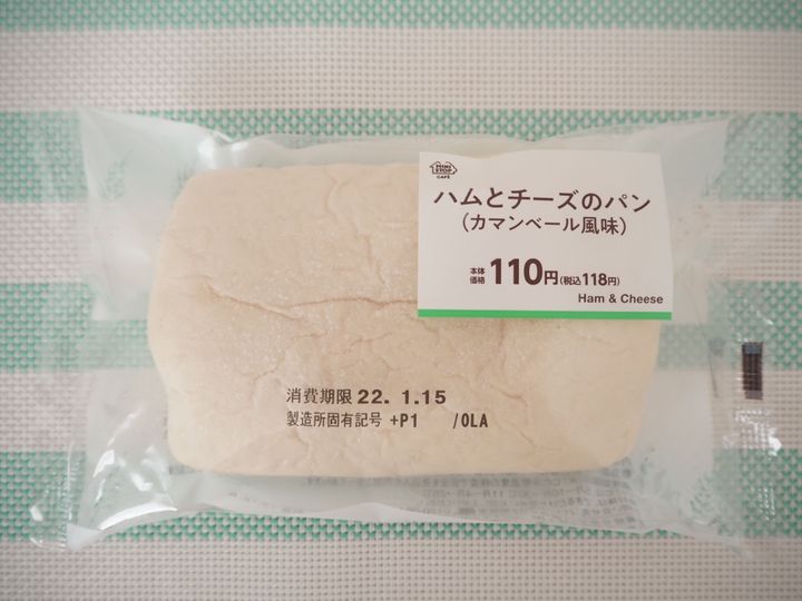 こちらが「ハムとチーズのパン(カマンベール風味)」で、価格は118円。シンプルすぎる商品名の通り、長方形の白パンの中にハムとチーズが入っています。