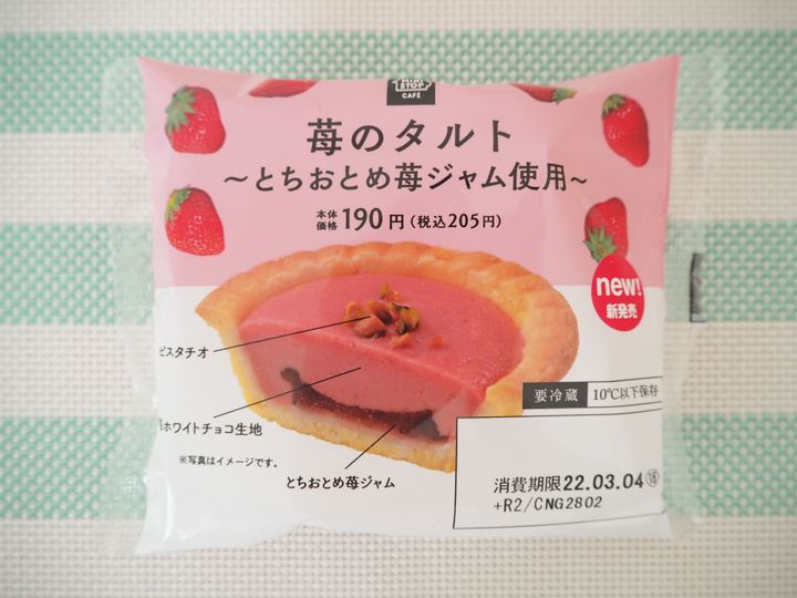 こちらが「苺のタルト~とちおとめ苺ジャム使用~」で、価格は205円(税込)。「とちおとめ」を使用したジャムが中に入った一口サイズのタルトです。イチゴの写真とピンク色のパッケージもかわいい!