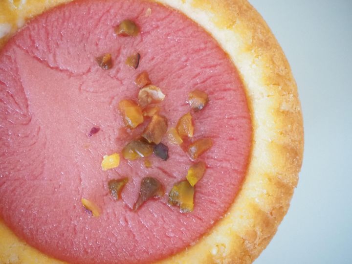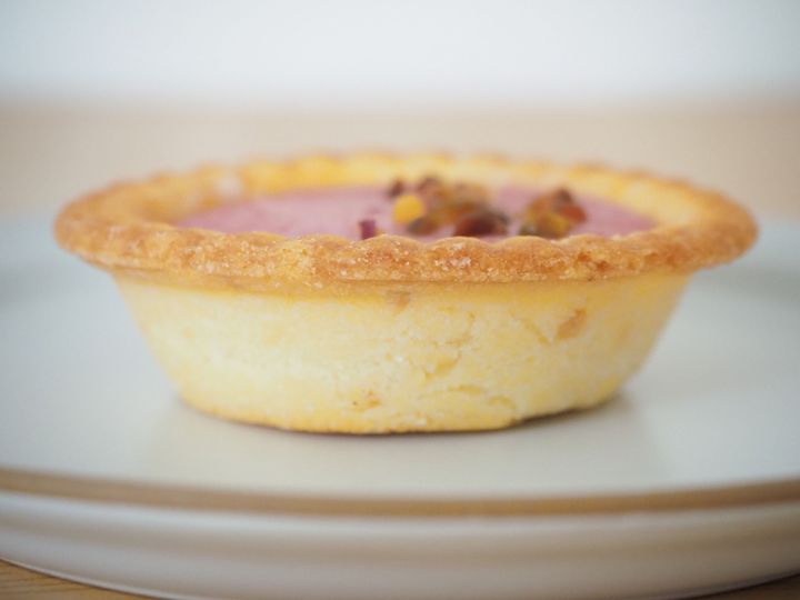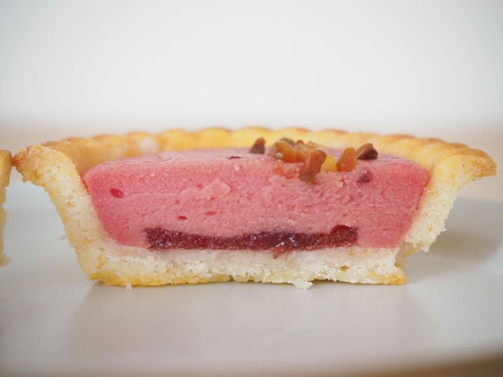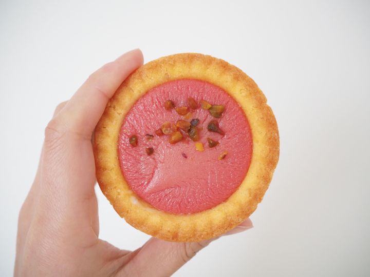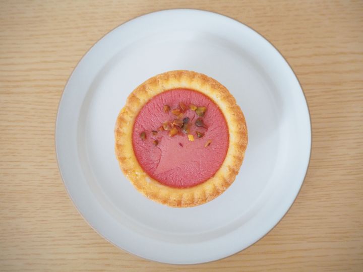 早速開封して、取り出してみましょう。タルト生地に収まった苺ホワイトチョコ生地の鮮やかなピンクに期待が高まります!