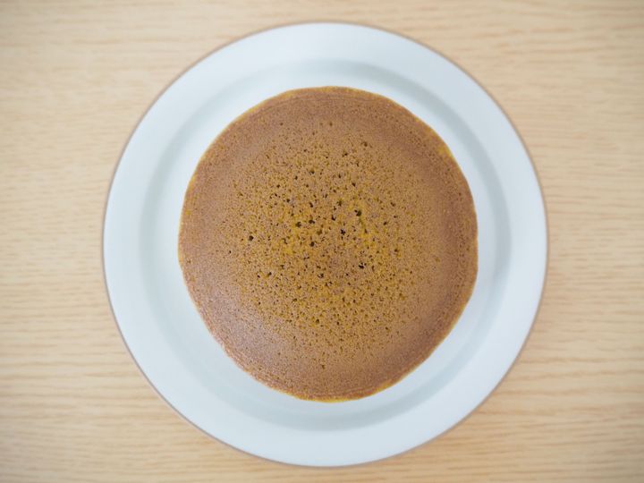 早速取り出してみてみると、抹茶のほのかな香りが漂います。しかし、上から見る限りではどら焼きのようですし、抹茶が入っているようにも見えません。