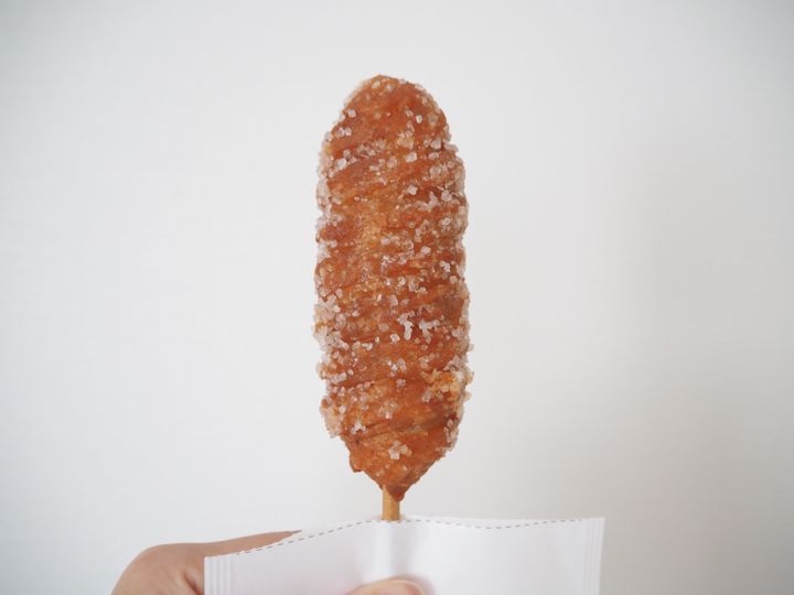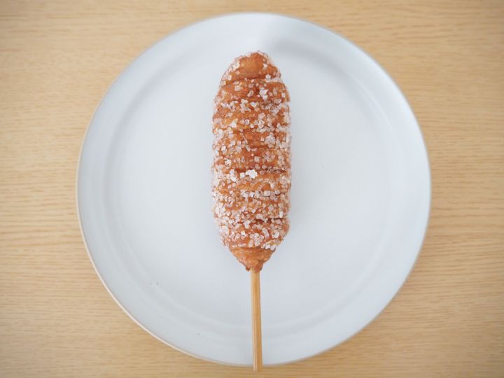 一般的なアメリカンドッグはソーセージに衣を付けて揚げますが、こちらは付けるというより巻いているよう。そのため、表面がリング上でデコボコしています。
