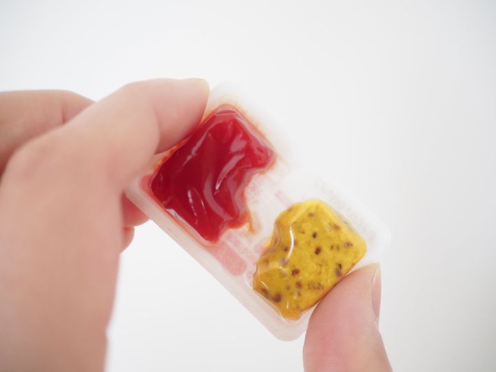 ポーションタイプのトマトケチャップと粗挽きマスタードが1つ付いています。お好みで付けてみてはいかがでしょうか?
