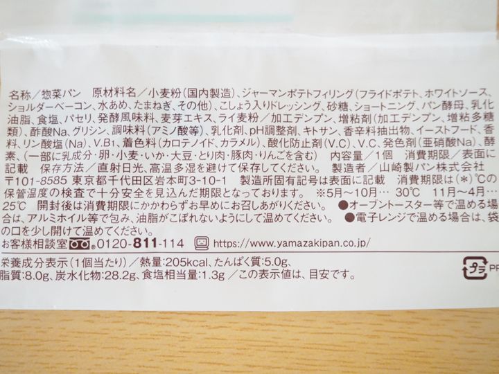 製造は山崎製パンが担当。カロリーは205kcalと、パンにしてはあまりカロリーが高くない印象です。