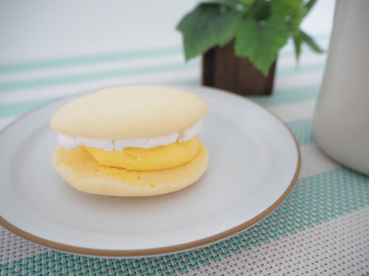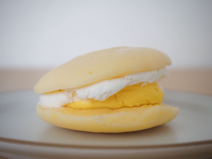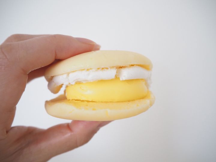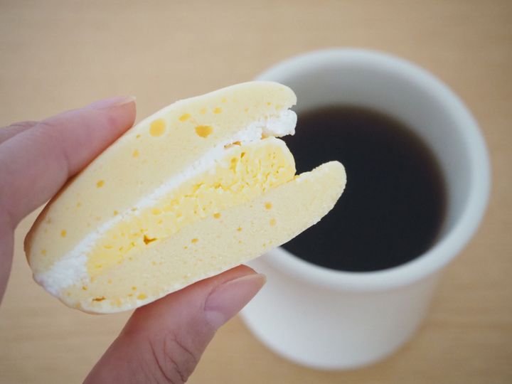 開封すると、チーズの香りがふわりと漂い、鼻をくすぐります。マカロンのような見た目をしていて、トッピングもなく、シンプルな作りです。