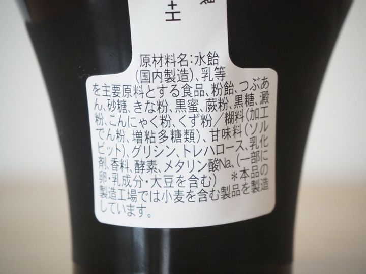 原材料を確認してみると、つぶあん、きな粉、黒蜜といった和素材が入っています。もちろんわらび餅に必要な蕨粉も入っていますが、こんにゃく粉も入っているということで、味や食感が気になるところ。