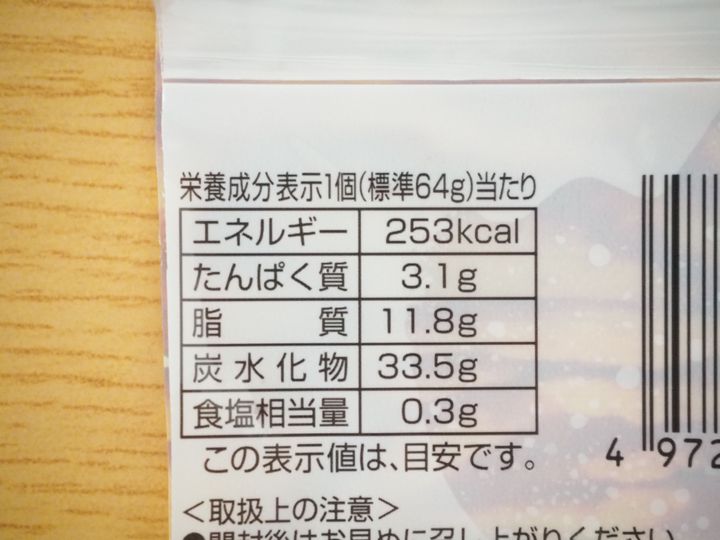 カロリーは253kcal。パッケージによると重さは約64gです。