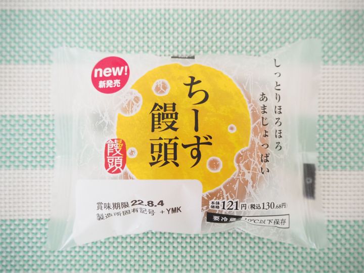 こちらが「ちーず饅頭」で、価格は130.68円(税込)。スイーツを扱う冷蔵コーナーで見つけることができました。