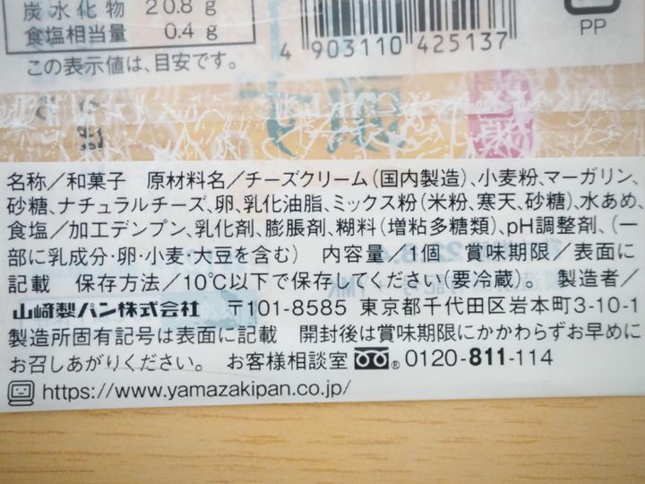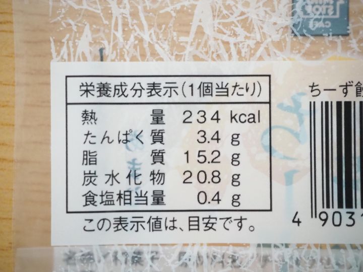 原材料を見ると、最初に書かれているのがチーズクリーム。ということは、チーズクリームの重量の割合が最も高いはず。外からはわかりませんが、中にたっぷり詰まっているものと思われます。