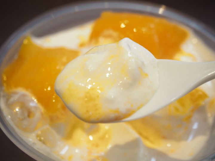 大きくカットされた完熟マンゴーが4つトッピングされていて、見るからにとろけるような質感があります。