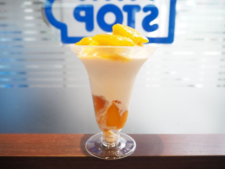 こちらが「完熟アップルマンゴーパフェ」で、価格は398.52円(税込)。店内のイートインスペースで食べる場合は税率と、それによる価格が変わるのでご注意ください。