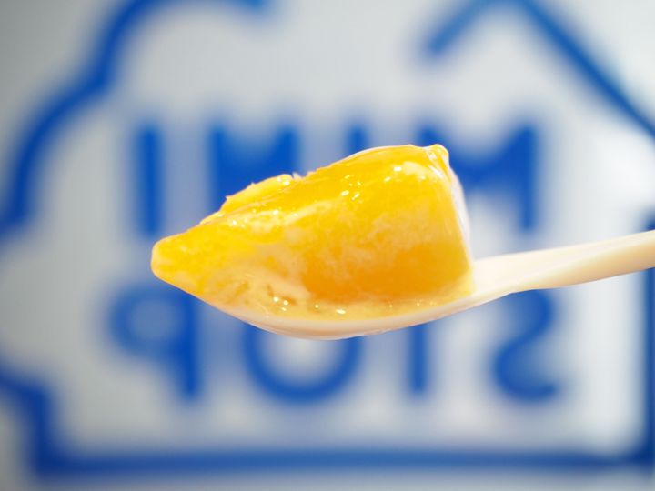 完熟マンゴーはスプーンからはみ出るほどの大きさ。表面はつるりとした舌触りですが、噛むとねっとりとした食感を楽しめます。そして数回噛むだけで、溶けるようになくなっていく…!