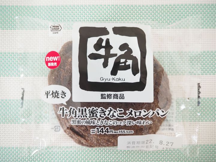 こちらが「平焼き牛角黒蜜きなこメロンパン」で、価格は155.52円(税込)。牛角のロゴが大きく入ったパッケージに、つい目が行ってしまいますね。