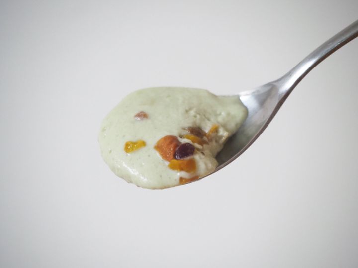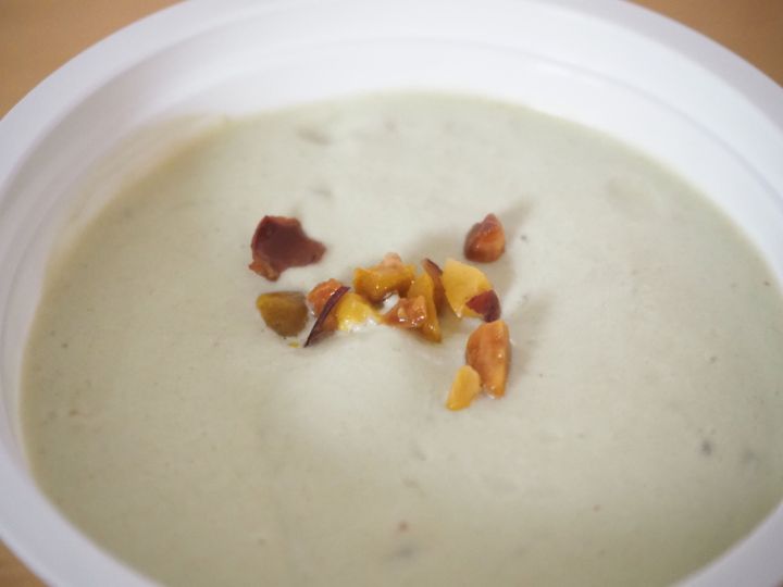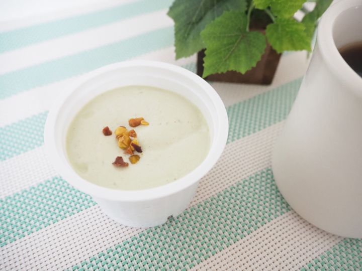 ふたを開けて中身をチェック!表面は淡い緑で、中心には細かく刻まれたピスタチオがトッピングされています。
