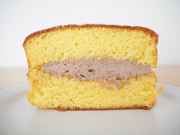生地はちょうど半分くらい位の高さでカットされていて、その隙間からはサンドされたチョコクリームがちらり。濃い卵色の生地もおいしそうですね。