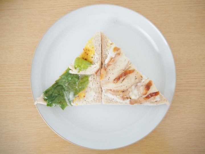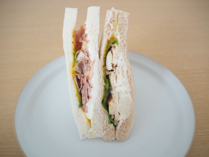 2つ入りで、うち1つは全粒粉入り食パンを使用するというこだわり。どちらにもお肉が入っていて、食べ応えがありそうですね。