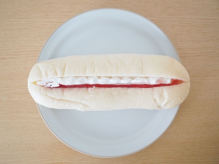 早速開封してみます。白くて長いロールパンに切り込みが入っていて、そこにミルクホイップといちごジャムがサンドされています。