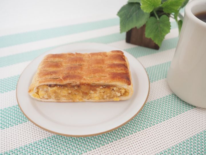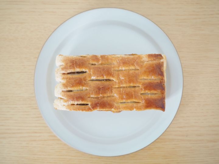 上から見ると、切れ目が入っていてパイそのもの。つや出しもされていて、見た目にもおいしそうですね。鼻を近づけると香ばしさが伝わり、食べるのがますます楽しみに。