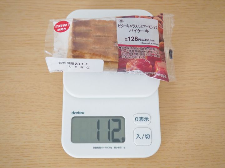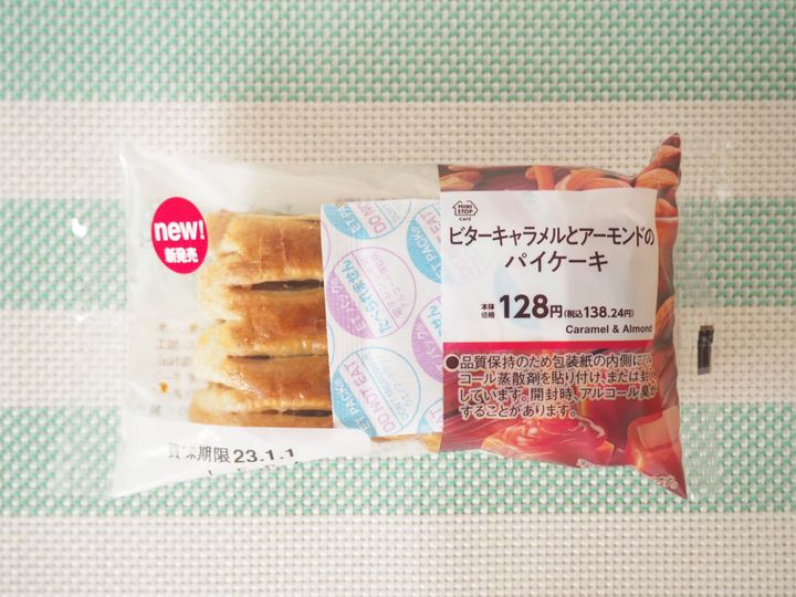 こちらが「ビターキャラメルとアーモンドのパイケーキ」で、価格は138.24円(税込)。小さいながら持つとずっしり感があり、食べ応えも期待できそうです。