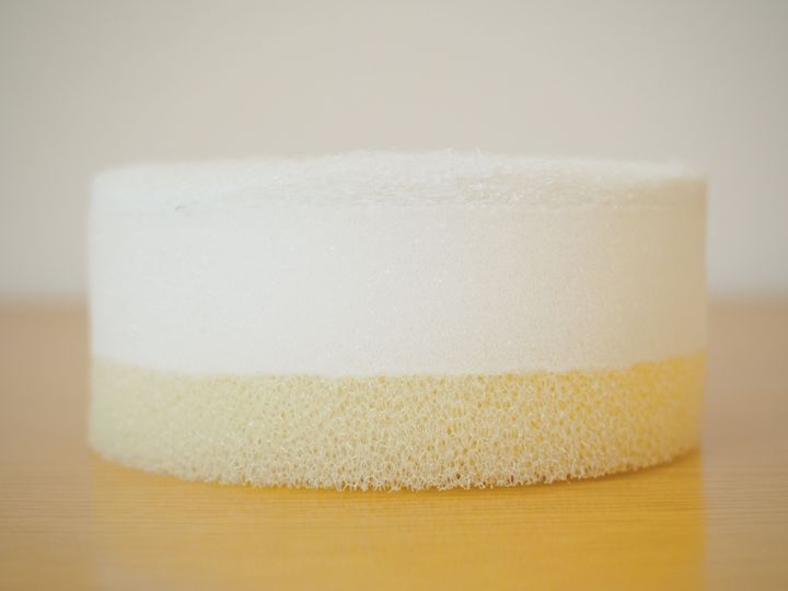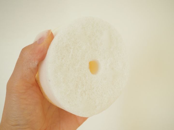 スポンジは3層構造。公式ホームページによると、これによって泡立ちと泡持ちの良さを実現しているそうです。浴槽にあてる面はやや硬めで、しっかり汚れを落としてくれそうです。