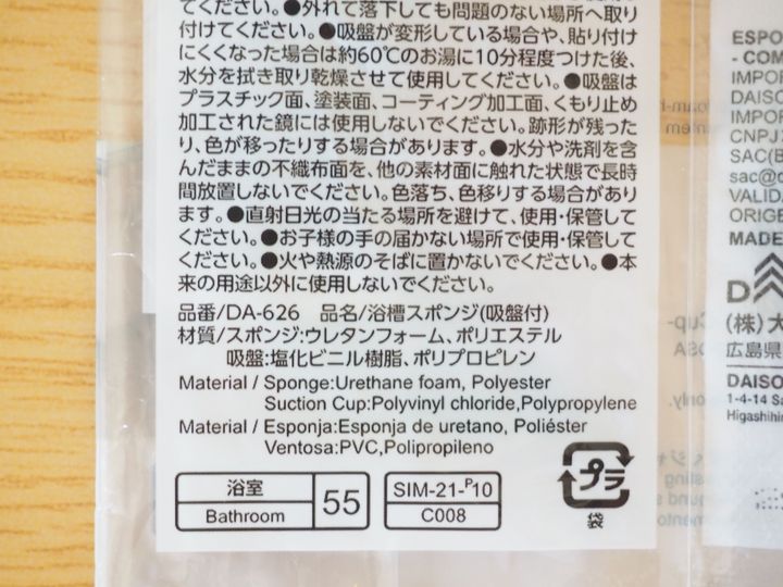 材質はスポンジがウレタンフォームとポリエステル、吸盤が塩化ビニル樹脂とポリプロピレンです。