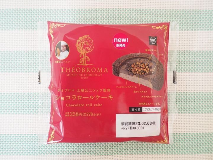 こちらが「テオブロマ土屋公二シェフ監修ショコラロールケーキ」で、価格は278.64円(税込)。赤いパッケージには、ゴールドで描かれたテオブロマのロゴがあしらわれています。
