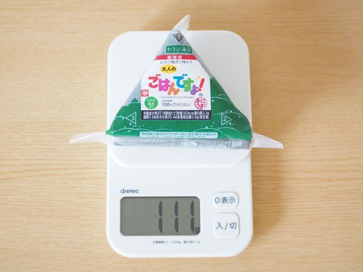 開封してみたところ、一見すると普通のおにぎりです。3辺のサイズはそれぞれ約7cm、高さは約6cmで、一般的なサイズ感。
