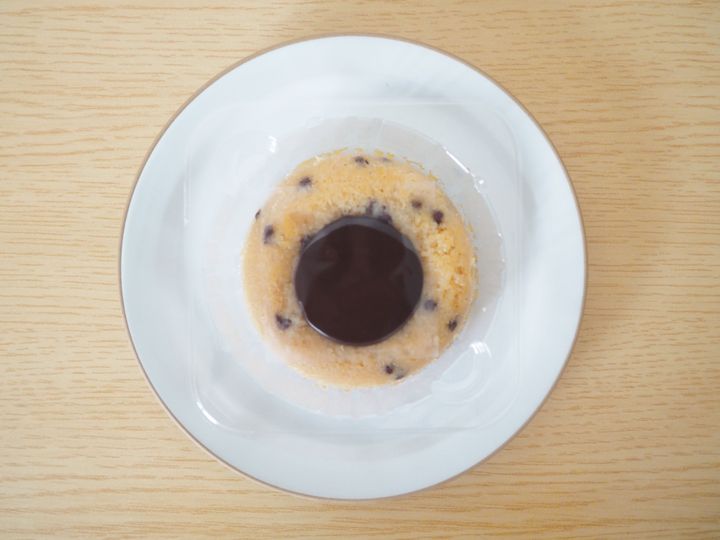 では開封してみます。見た目は円盤状で、まんべんなく練りこまれたチョコチップは、確かにトラ模様のように見えますね。中心にはチョコソースがたっぷりとトッピングされています。