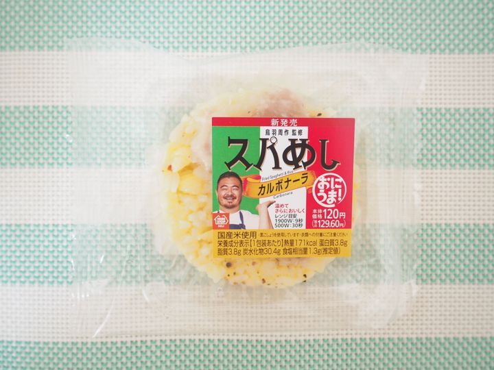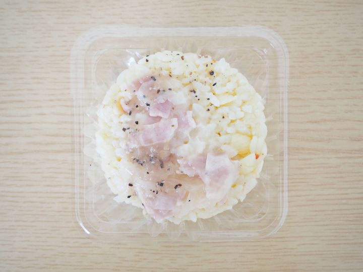 そしてもう1つが「スパめし(カルボナーラ)」。こちらも価格は129.60円(税込)です。カルボナーラといえば卵と牛乳もしくは生クリームを合わせたソースですが、それがおにぎりと組み合わさると一体どうなるのでしょう?
