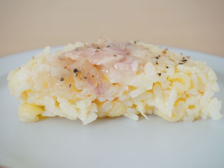 カルボナーラは黒胡椒のピリッとした香りが広がり、食欲がそそられます。こちらも具材がトッピングされていて、マカロニらしきものがお米に交じっているのも確認。