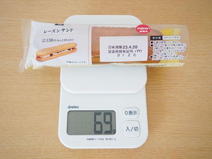 こちらが「レーズンサンド」で、価格は149.04円(税込)。冷蔵スイーツコーナーで見つけました。