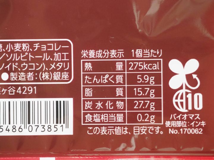 赤と茶色を基調としたパッケージにはゴールドで「Ghana」の文字。これでもかというくらい、「ガーナチョコレート」の使用を主張しています。一方で「銀座コージーコーナー」のロゴは左上に小さくあるのみ。自社のロゴを差し置いてでも「ガーナチョコレート」を強調するという点で、コラボに対する並々ならぬ熱意を感じます。
