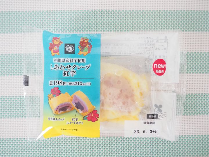 一足先に旅情を味わいたい人は、沖縄フェア真っ最中のミニストップへ足を運んでみてはいかがでしょう?沖縄を感じさせる新商品がたくさんあり、食べれば行った気分になるかも!?というわけで、新商品の1つ「しあわせクレープ紅芋」を紹介します。